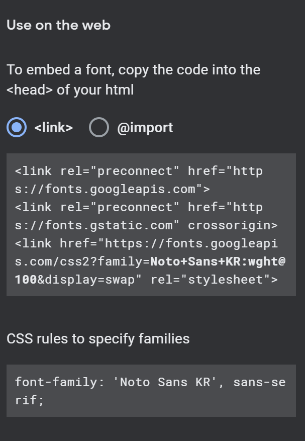 -위와 같이 link와 css에 작성하면 적용될 코드들이 둘 다 나와있음