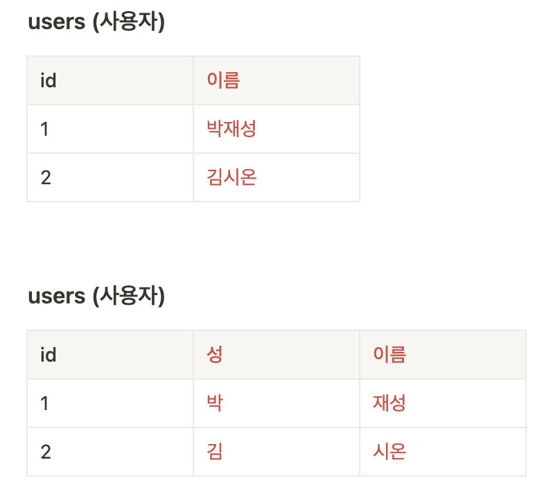 예를 들어, 서비스에서 성과 이름을 따로따로 조회해야 하는 경우가 많다면 2번째 테이블의 형태로 구성하는 게 좋다. 반대로 서비스에서 성과 이름을 따로따로 조회할 일이 없고 통째로 쓰는 경우만 있다면 1번째 테이블의 형태로 구성하는 게 좋다.