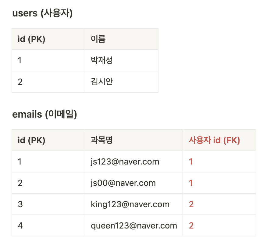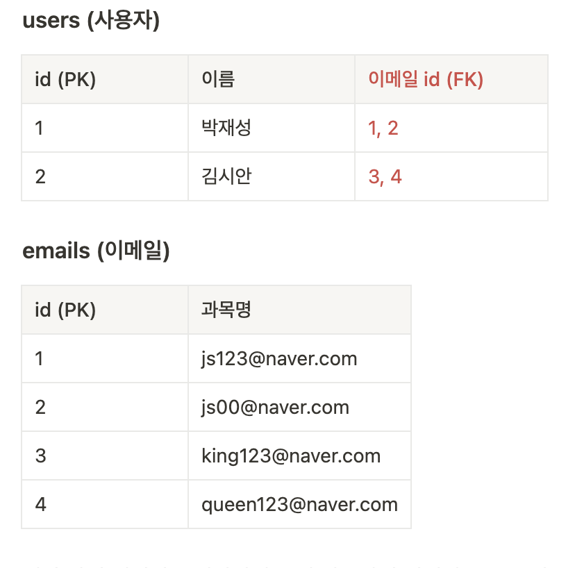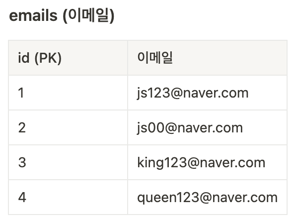 위와 같이 데이터를 저장하니 특정 사용자의 이메일 주소를 알 수는 있게 됐다. 하지만 한 칸에 2가지 이상의 정보가 다시 들어가게 됐다. 이럴 때는 FK를 다른 테이블로 옮겨보자. 즉, FK의 위치를 users 테이블에서 emails 테이블로 옮겨보자.
