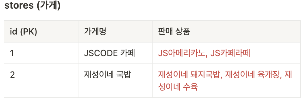 한 칸에 두 가지 이상의 정보가 들어가있을 땐, 테이블을 분리해서 FK를 활용해 한 칸에 한 가지의 정보만 들어가게 만들어야 한다.