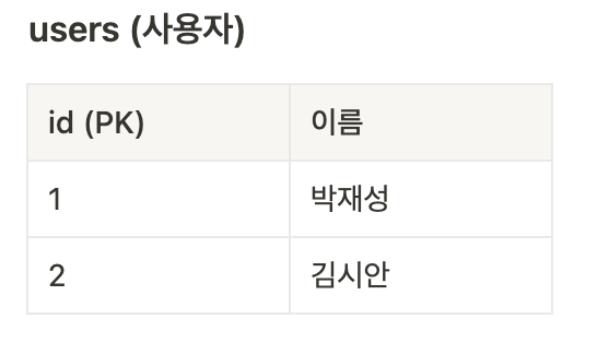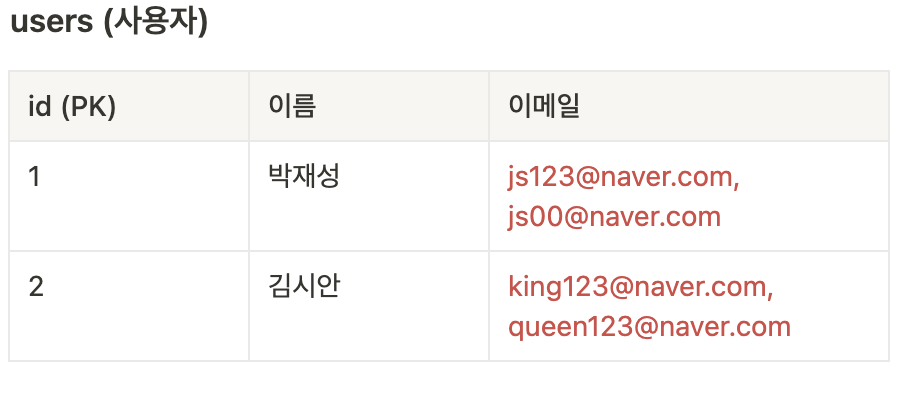 위와 같이 데이터를 저장하니 특정 사용자의 이메일 주소도 알 수 있고, 한 칸에 한 가지의 정보만 들어가게 만들었다. 위와 같이 테이블을 분리해야 한다.