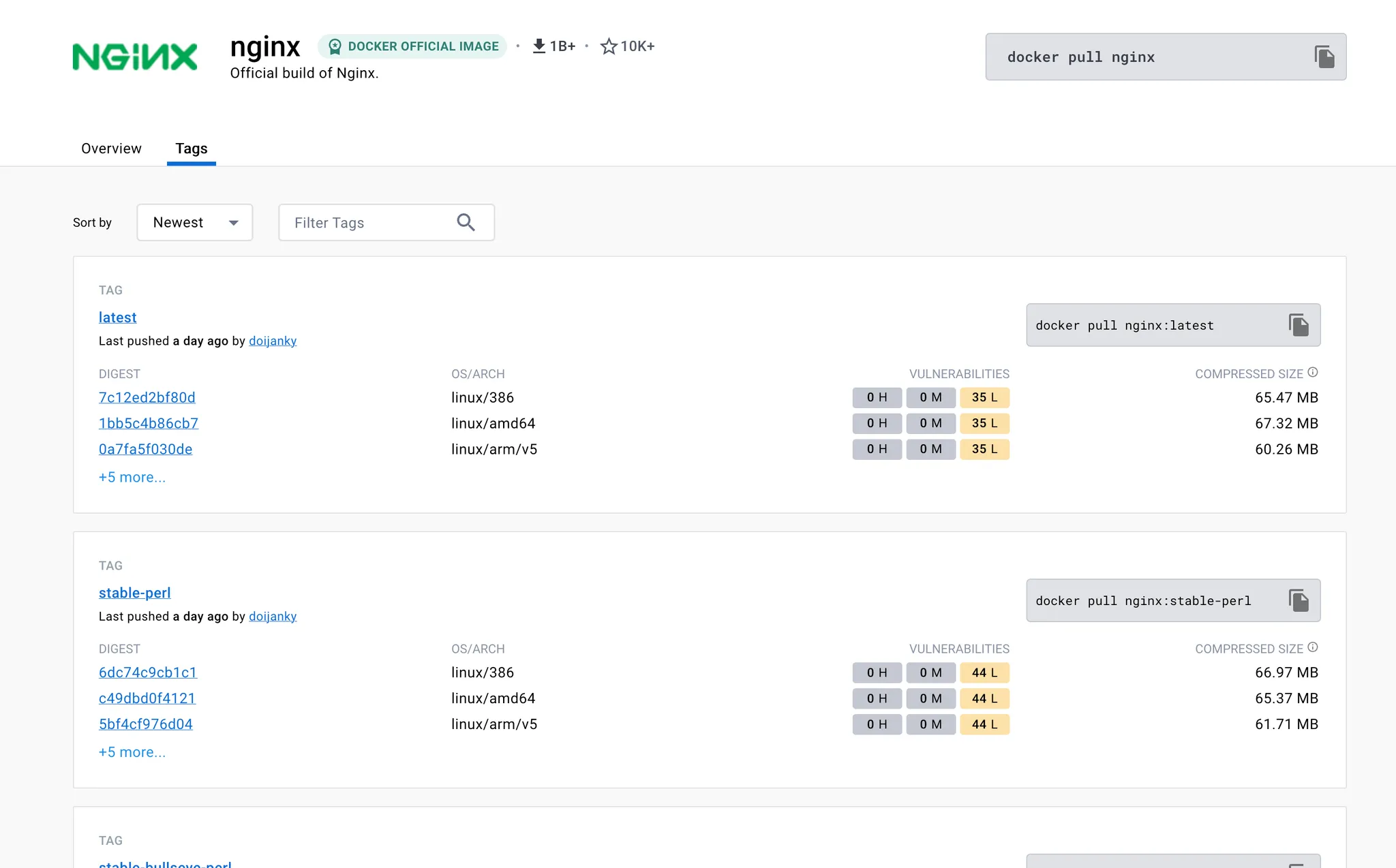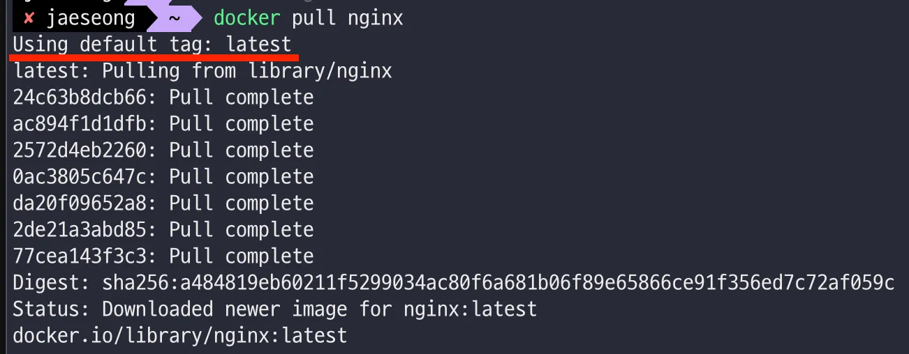 $ docker pull nginx # docker pull nginx:latest와 동일하게 작동