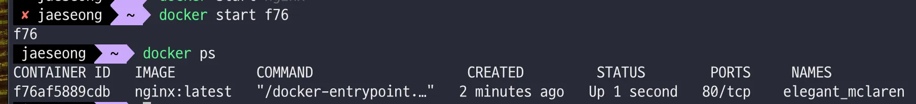 $ docker start 컨테이너명[또는 컨테이너 ID]