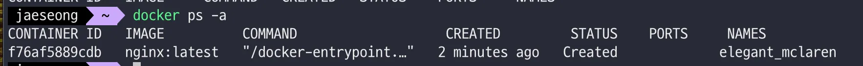 이미지를 바탕으로 컨테이너를 생성하는 명령어이다. 그러나 컨테이너가 실행되지는 않는다.