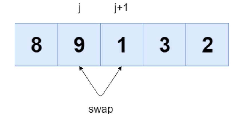 버블 정렬은 현재 배열 요소와 그 다음 배열 요소를 비교한다음 조건에 걸리면 교환하는 식의 정렬