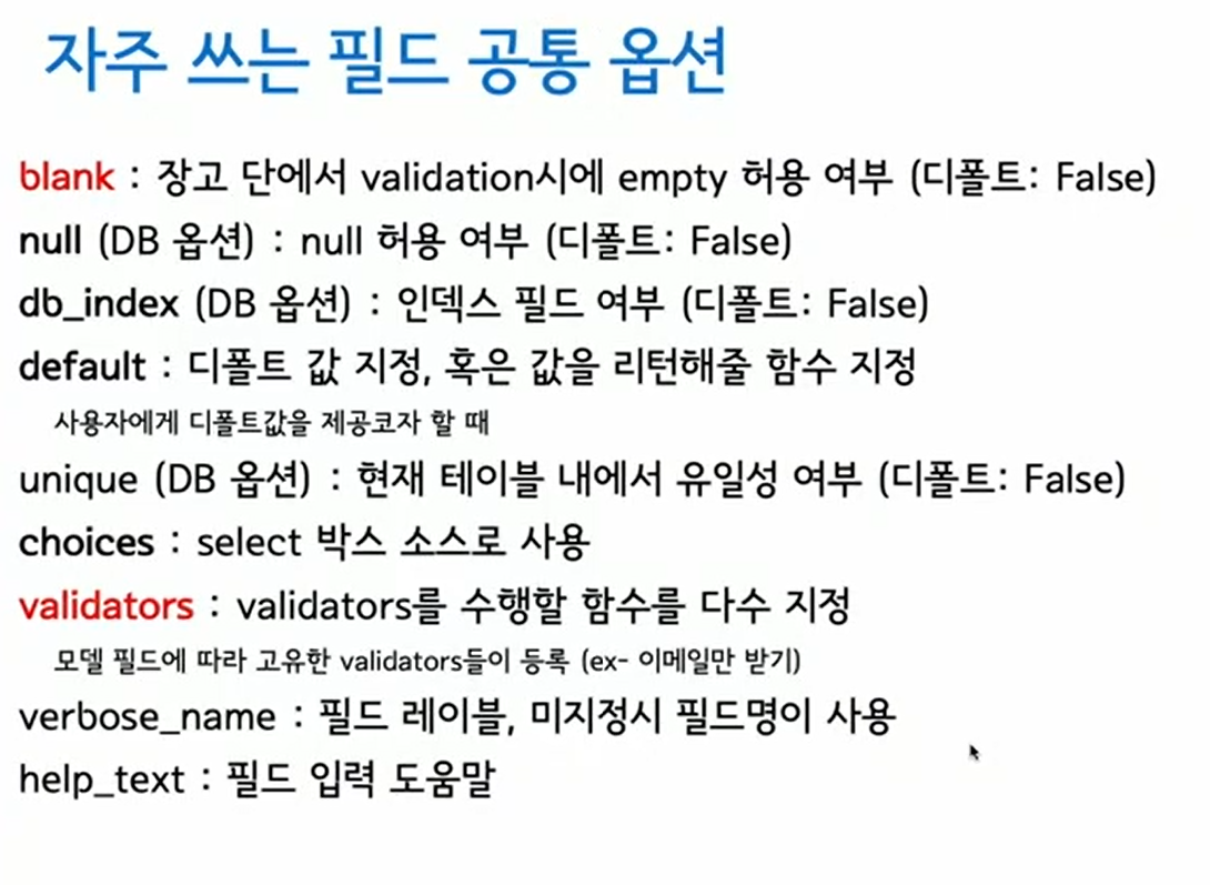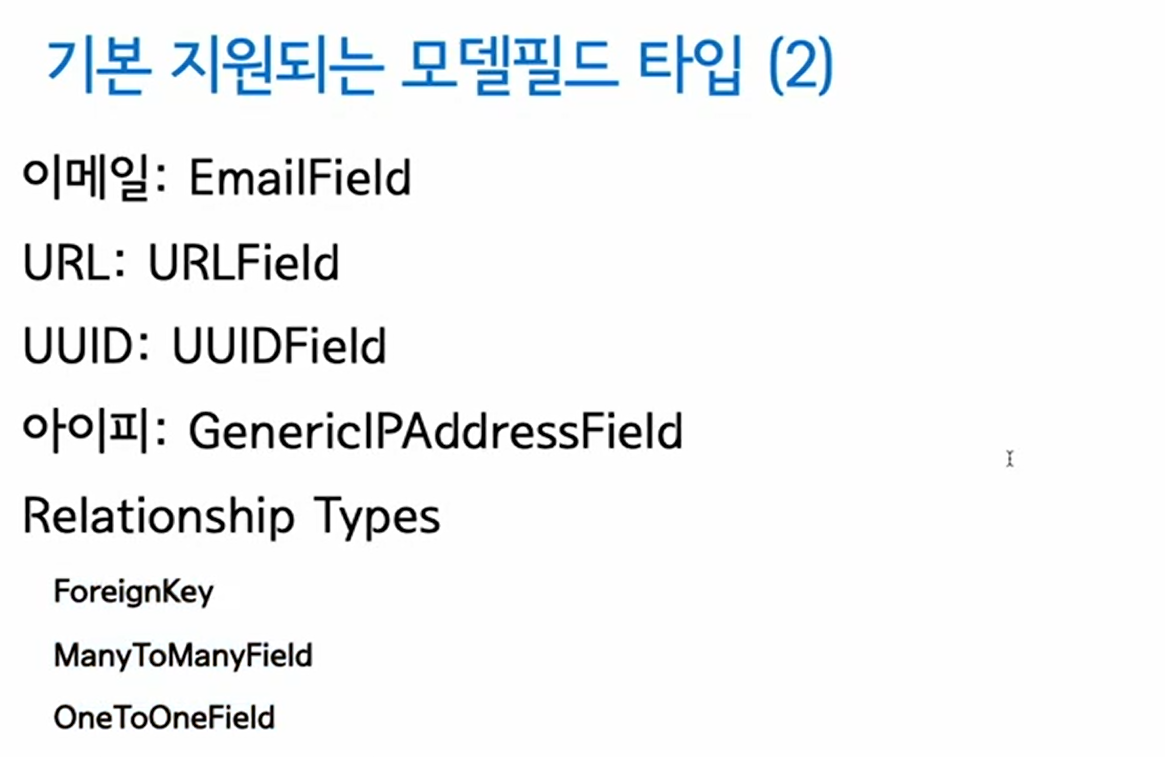 기본 지원되는 모델필드 타입